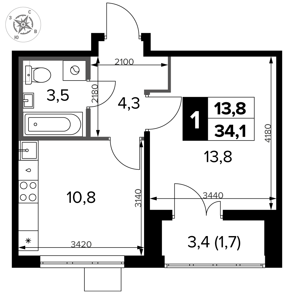 Площадь 34.10 м²