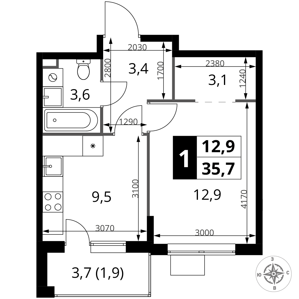 Площадь 35.70 м²