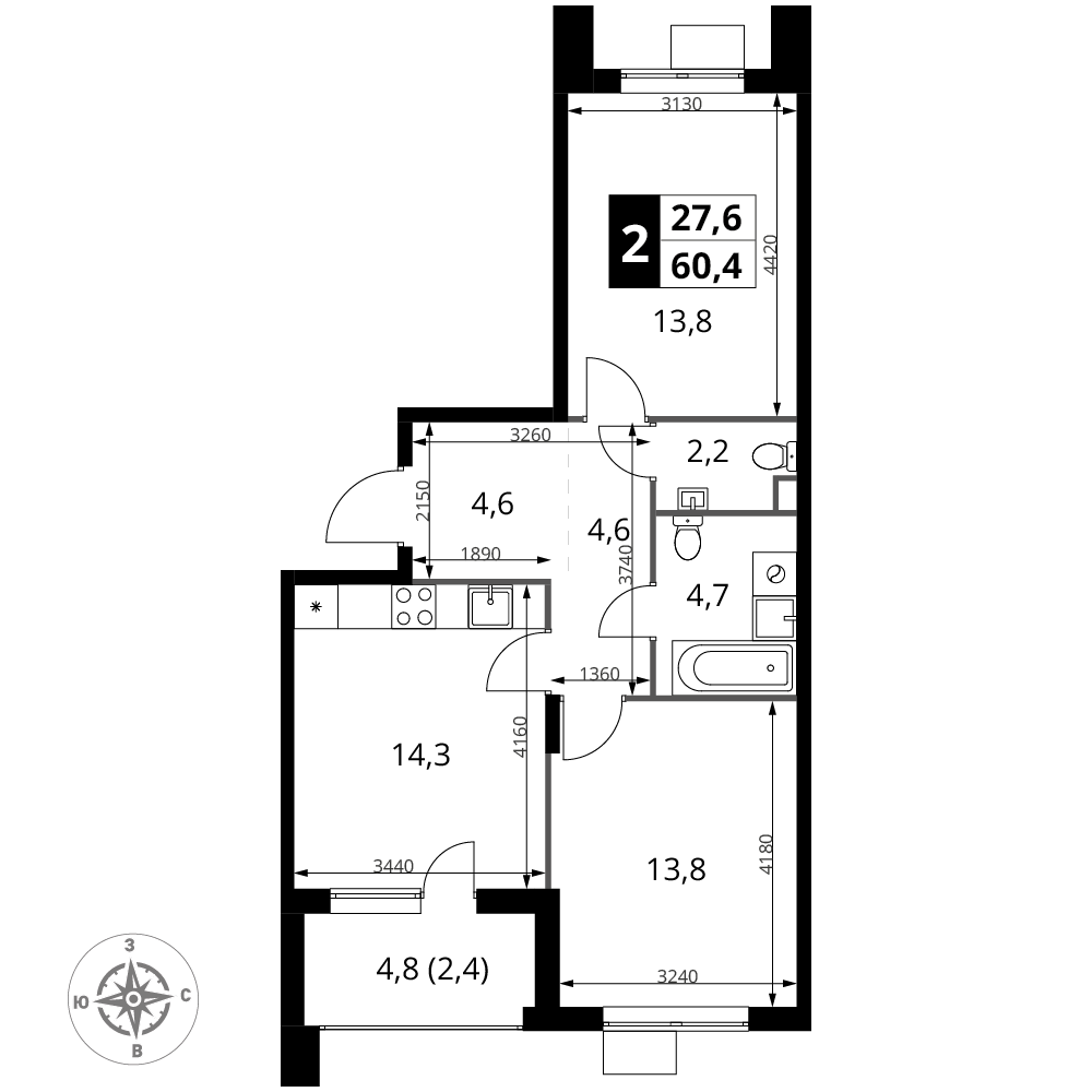Площадь 60.40 м²
