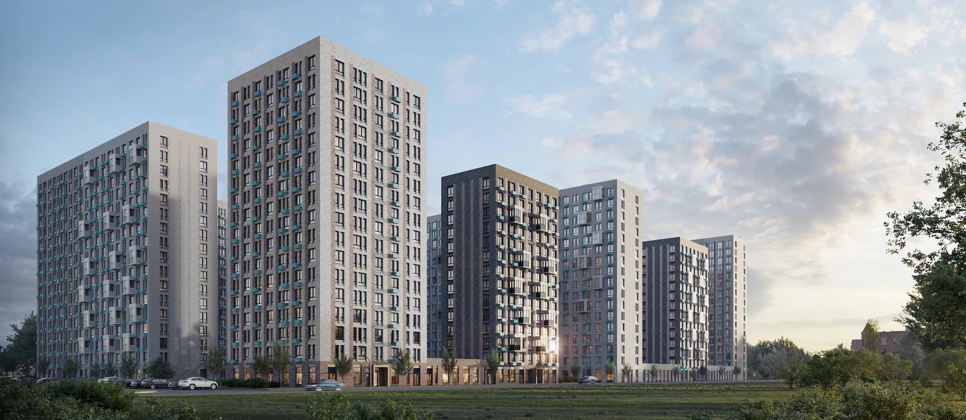 в жилом комплексе — от 14 до 17 этажей. Отделка из кирпича, фиброцемента и