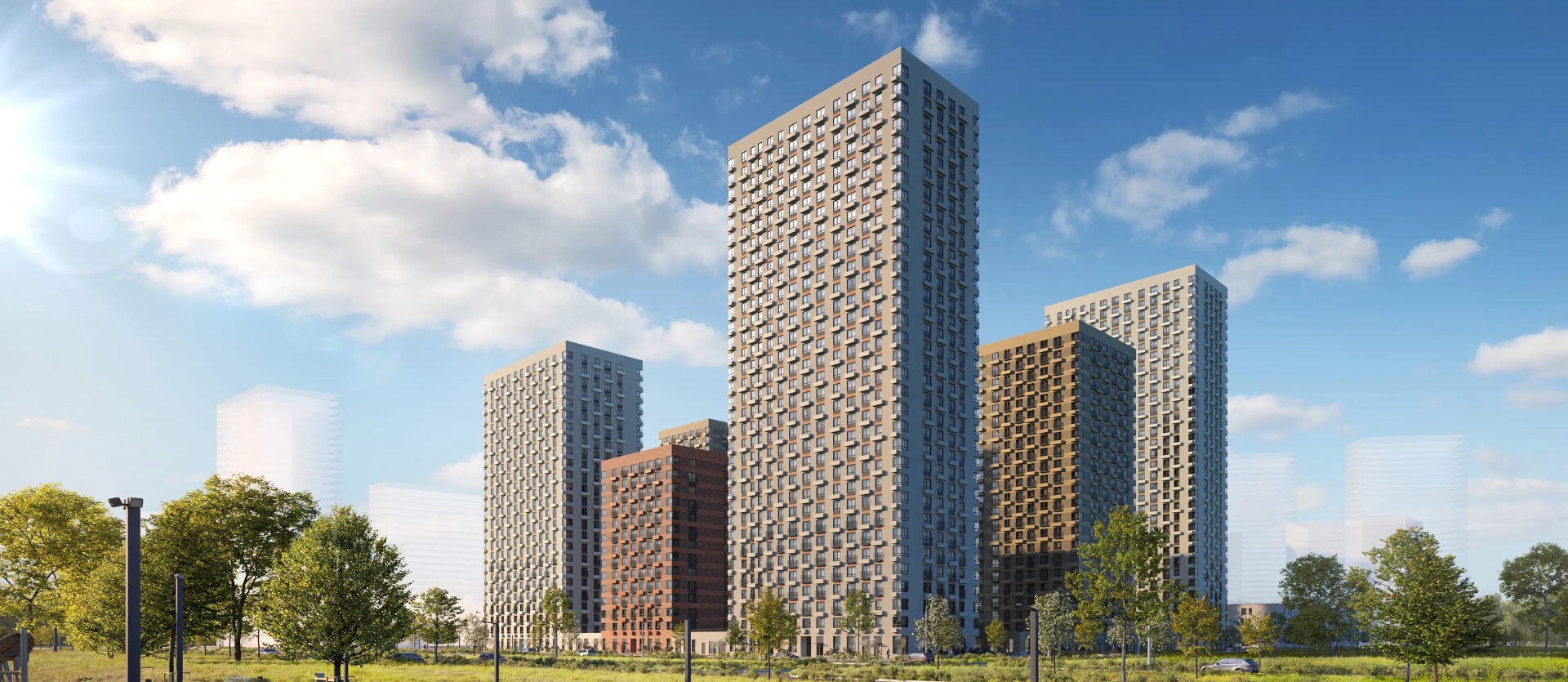 домов с подземным паркингом и кладовыми, два детских сада и школа. Между домами