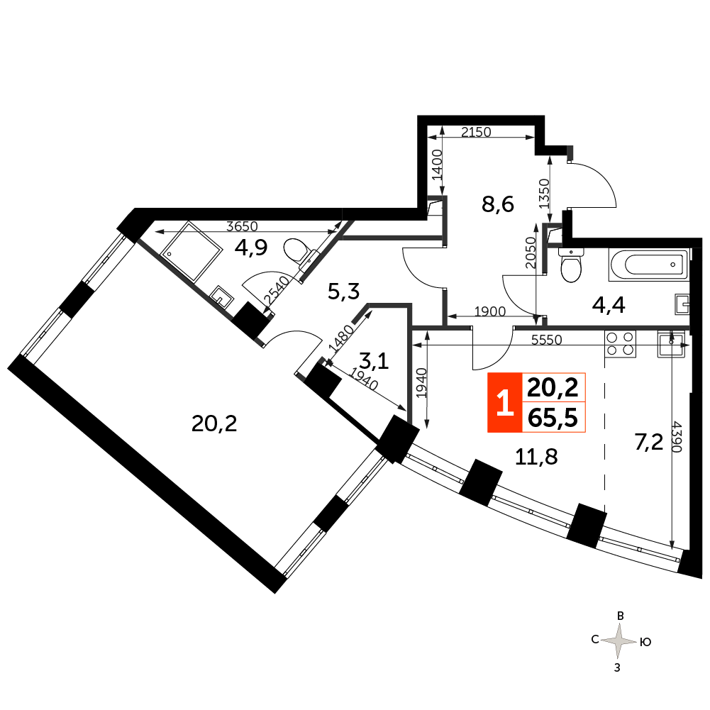 Площадь 65.50 м²