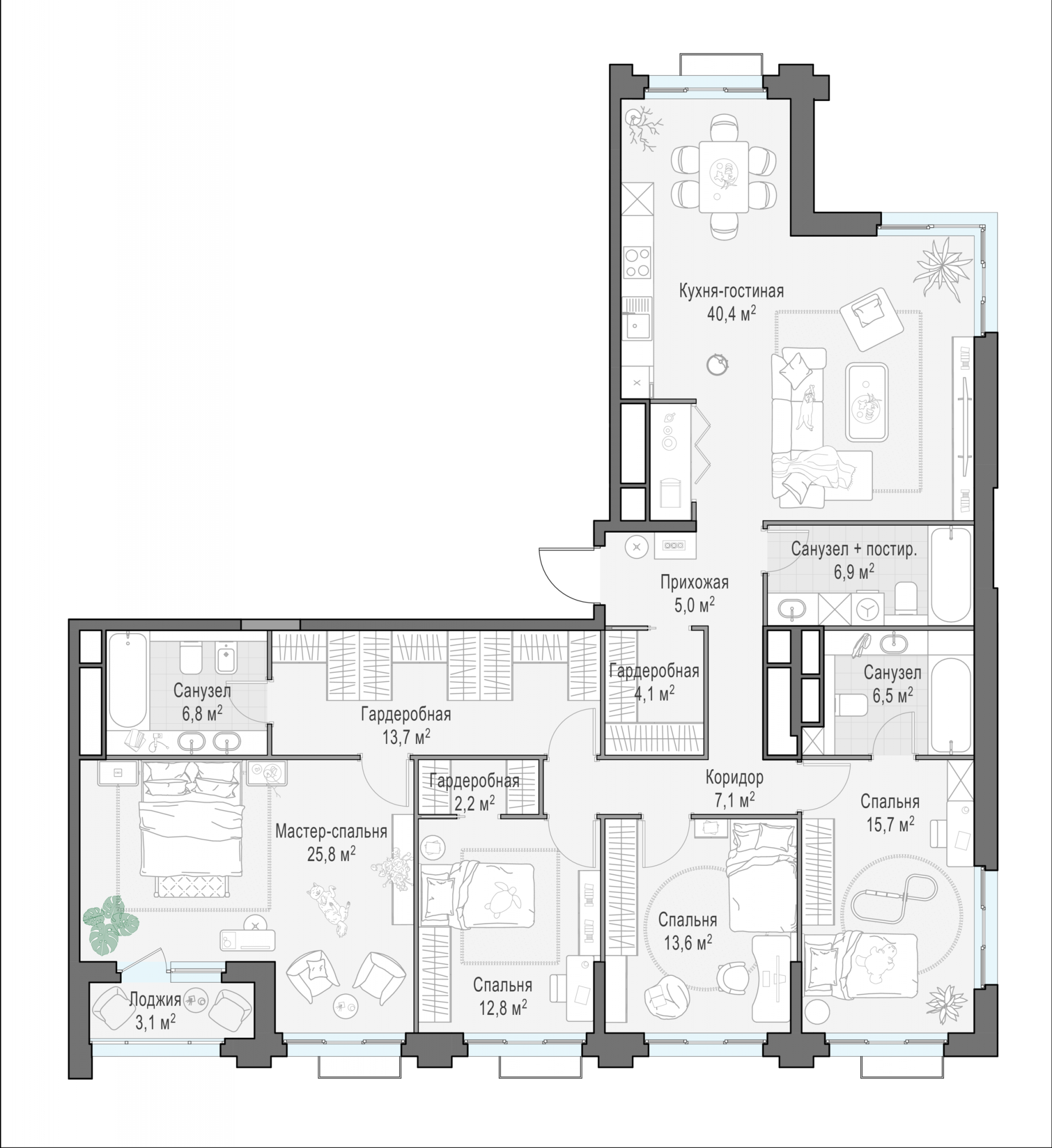 Проект архитектурного бюро Glekel. Внутри предусмотрены просторные лобби с зонами отдыха и встречи гостей, помещения для хранения колясок и крупногабаритных предметов, санузлы и даже специальные зоны с лапомойками для домашних животных.