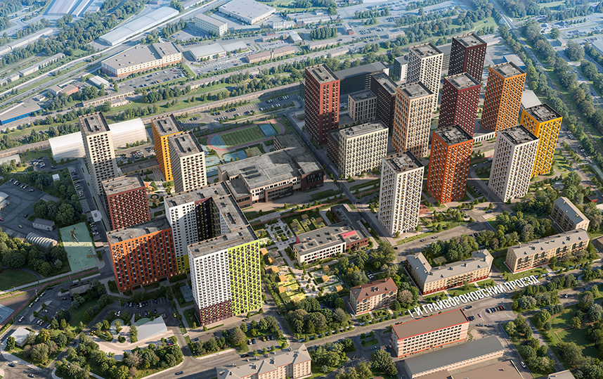 жилых домов, детский сад, школа, подземные и надземные паркинги. На первых